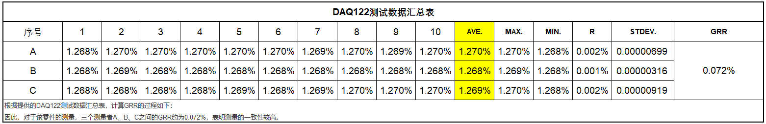 Pour s'assurer que la carte d'acquisition de données sélectionnée répond aux exigences, l'équipe ME l'a testée. L'analyse montre que la carte d'acquisition de données sélectionnée présente une excellente stabilité, avec un GRR d'environ 0,072 % parmi les trois mesureurs A, B et C.