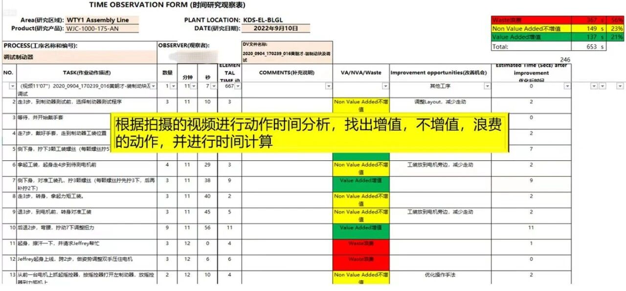 En tant que premier outil d'amélioration systématique introduit en interne, l'analyse du temps a accumulé une solide expérience d'amélioration. Il a également joué un rôle pionnier dans la démarche globale d’amélioration de VSM, servant à la fois de continuation des améliorations précédentes et de lien vers les améliorations ultérieures spécifiques au projet. Les équipes d’amélioration ont affecté du personnel dédié pour filmer les opérations des employés à chaque processus conformément aux principes d’horaires de travail standard. Les membres de l'équipe et même les employés de première ligne ont examiné conjointement les vidéos à plusieurs reprises, décomposé et analysé les mouvements de travail et mené un brainstorming collectif pour identifier les opportunités d'amélioration et proposer des suggestions, pour finalement formuler un plan d'amélioration.