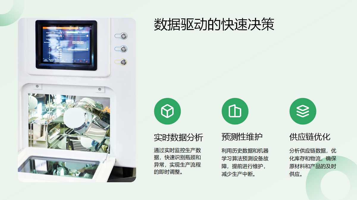 • Prise de décision rapide basée sur les données : prenez des décisions rapides grâce à l'analyse des données en temps réel, à la maintenance prédictive et à l'optimisation de la chaîne d'approvisionnement.